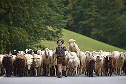 Shepherds with herd during the Almabtrieb in the Pitztal