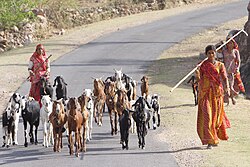 Women drive their cattle and sheep to the watering hole, Rajasthan, India