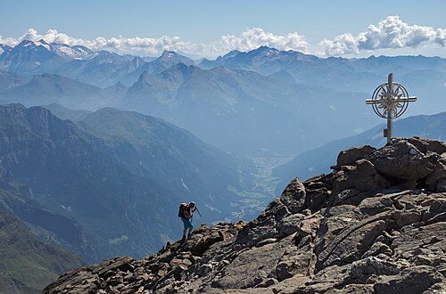 A hiker on the last meters before reaching the summit of the Schneespitze in the Stubai Alps |