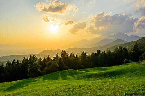| Title | A hill dream | Sunset over a green meadow with forest in foreground and layered mountain silhouettes in the distance, under a glowing orange sky. |