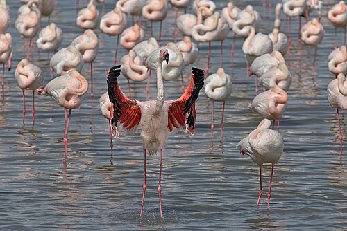 Flamingos, one shakes itself after a bath, Parc Ornithologique de Pont de Gau, Camargue, France |