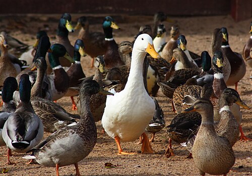 a goose surrounded by ducks |