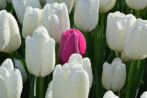 | Title | One purple Tulip surrounded by a few white Tulips. |