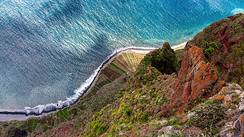 Blick von der 580 Meter hohen Steilklippe „Cabo Girao“ auf die am Ufer liegenden Terrassenfelder in der Nähe der Ortschaft Câmara de Lobos auf Madeira. |