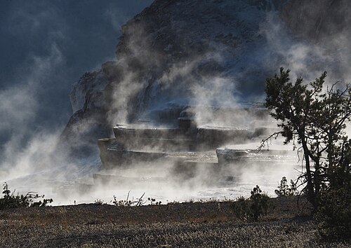 Sinter terraces full of steam in the morning sun, Lower Mammoth Hot Springs, Yellowstone National Park |