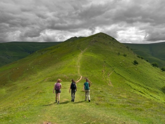A picture of three people hiking the path called "Dragon's Back" in Brecon, Wales. Taken by Lauren Moon in June of 2024. |