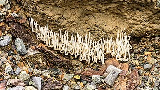 English : Val Sinestra. Candlestick fungus (Xylaria hypoxylon) on an erosion field.