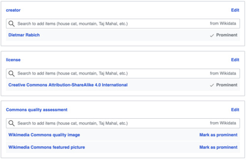 Also under the Structured data tab, you can add other descriptive information about the file. This example describes the file's license, creator and quality assessment.