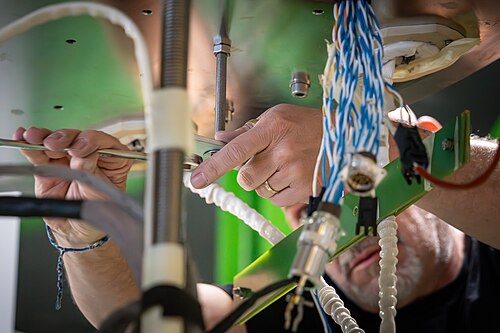 Inspecting the SuperDARN radar antenna installed at the Concordia research station, Antarctica (Paride Legovini).